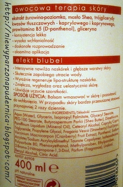 Skład całkiem ładny. Producent obiecuje doznania jak z bajki. Nie zawiodłam się. Po pierwsze- zapach jest taki zajebisty, że aż strach. Co prawda utrzymuje się średnio długo- tak do kilku godzin, ale jest bombowy. Soczysta poziomka wymieszana z kwaskowatą żurawiną, aż chce się lata! Po balsamowaniu zwłok zwłoki nie wyślizgują się z worka/dywany czy w co tam zwłoki wsadzicie (przed pozostawieniem w lesie pamiętajcie, żeby ciało posypać wapnem!). Świetnie się wchłania, a skóra rzeczywiście jest bardzo dobrze nawilżona. Myślę, że można by produkt zareklamować reżyserom porno, jeśli akurat skończyłby im się lubrykant. Niby takie leciutkie, niepozorne mazidło, a efekty na prawdę spoko. Dużym plusem jest to, że rozprowadza się błyskawicznie, rachu-ciachu i można zakładać kalison bez strachu, że na dupce się utłuści.