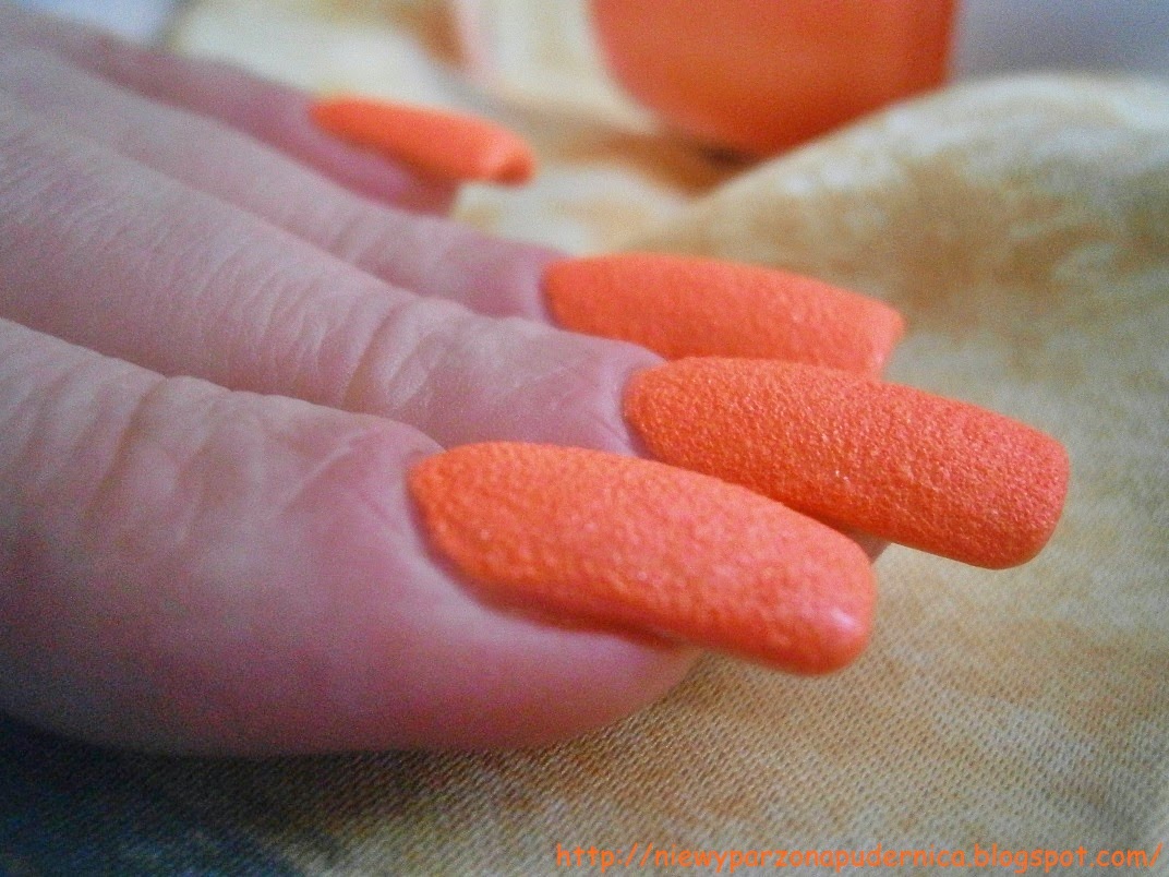 Kolor tak jak wspominałam jest oczojebnym pomarańczem, ale w różnym świetle bije po oczach innym odcieniem. Tak lekko wpada w róż od czasu do czasu jak mu się przypomni. Na moich zdjęciach akurat mu się zapomniało.