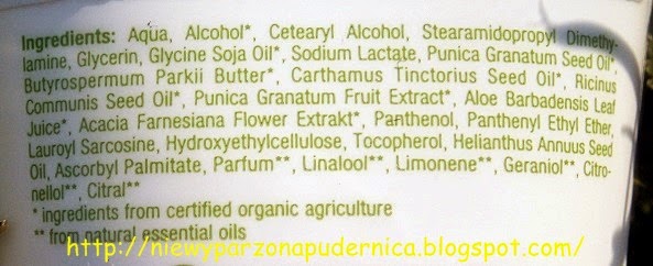 Rzeczywiście maska ta bublem nie jest. Włosy ładnie nawilża, stają się sypkie i miłe w dotyku. Rozczesują się bez problemu i pachnie też przyzwoicie- po alterrowemu. Wszystkie szampony, odżywki, srywki od nich pachną dla mnie podobnie. Aromat różni się nieznacznie w zależności od tego czego ma więcej w składzie.  A jeśli o skład chodzi to proszę.