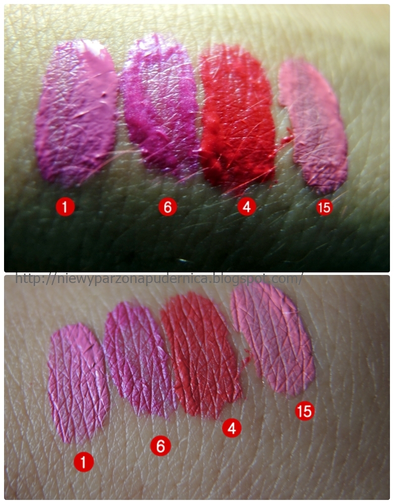 Kolory piękne, choć jak to z kolorami bywa- ciężko je uchwycić na zdjęciu, żeby nie odbiegały od rzeczywistości. Na górze pomadka “świeża”, na dole zaschnięta. Zasycha w max 5 minut. Nakłada się łatwo, jest dość gęsta i ładnie się rozprowadza. Pachnie ładnie- jakieś słodkie winogrona. 1,4,15 są typowo matowe, a 6 lekko połyskuje, ale nie jakoś tandetnie, nazwałabym ją satynową. Pomadkę należy używać oszczędnie- jedna warstwa daje piękny kolor bez prześwitów. Jeśli nawalimy jej zbyt dużo będzie odchodzić płatkami jak jakaś farba. I teraz kurwa szok- trzyma się 6 godzin bez żadnego uszczerbku. Po 6 godzinach leciutko wyciera się w okolicach otworu gębowego, ale to jest serio minimalne wycieranie. Mówię o 6 godzinach podczas których jemy, pijemy i się całujemy. Nic nie jest w stanie zabić tego cuda. Najdłużej miałam ja na ustach jakieś 12-14 godzin i nadal wyglądała całkiem ok. Potem szłam spać więc musiałam ją zmyć. Podczas używania nie jedzcie smażonych pierogów! A serio to po pierogach schodzi, a właściwie po oleju 😉 Olejem najlepiej ją zmyć. Micel też daje radę, ale trochę się trzeba namachać. Czymś tłustym schodzi bez problemu. Co ciekawe- nie wysusza ust! Powiem więcej, chyba nawet nawilża, bo po zmyciu usta są mega hiper super miękkie. No ja pierdole- hit!