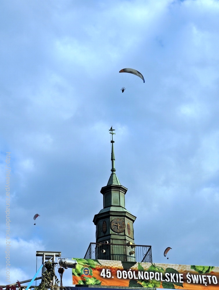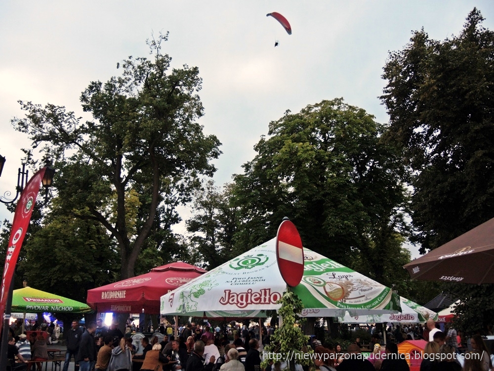Zacznijmy od tego, że Chmielaki to nie tylko żłopanie browara po całym mieście, to także imprezy towarzyszące- Półmaraton Chmielakowy i Chmieloty. Półmaraton to wiadomo- maraton, tylko że na połowę dystansu. W tym roku odbyła się czwarta edycja, ponoć w środowisku chwalone wydarzenie. Nie wiem, nie biegam, chyba, że do lodówki po piwo. Fotek też nie ogarnęłam, bo jak półmaratończycy zasuwali to ja kimałam. Wiem tylko (tak na mieście mówią), że pierwsi na mecie byli panowie z Donbasu. Uwaga chamski suchar- biegli najszybciej, bo przestraszyli się wystrzałów na starcie. Chmieloty miałam okazję podziwiać niemal non stop, bo “lotnisko” mam za domem. Całe lato panowie mi po niebie latają, a w Chmielaki to już istny wysyp. Miałam okazję się bujać na skrzydle i bardzo Wam polecam ten rodzaj rozrywki.