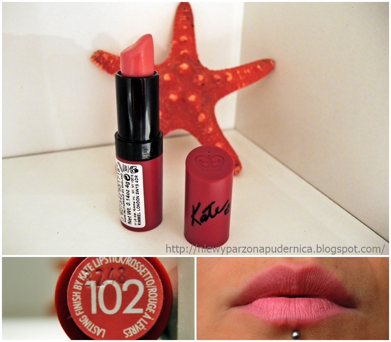Ta sama Kate w wersji matowej, odcień 102. W rzeczywistości kolor jest odrobinę ciemniejszy niż na mojej fotce. To taki przydymiony róż, bardziej zgaszony i nie aż tak neonowy. Ciężko mi było uchwycić kolor. Jest piękny. Szkoda, że głupia ja przepłaciłam w Esesmanie za Kasię, dałam całe cholerne 20 złotych, ech gupia ja. Szminka tak samo przyjemnie kremowa i pachnąca niewiadomoczym, noo tak pomadkowo, ładnie 😉 Wydaje mi się, że matowa siostra trzyma się dłużej, ale po całym dniu usta są takie nieswoje. Nie są przesuszone, ale są na dobrej drodze do tego. Mimo to pomadka fajna. Odcień ładnie komponuje się z opalenizną. Jest dość uniwersalna i podobnie jak 26 będzie pasowała większości kobitek i do większości stylóweczek.