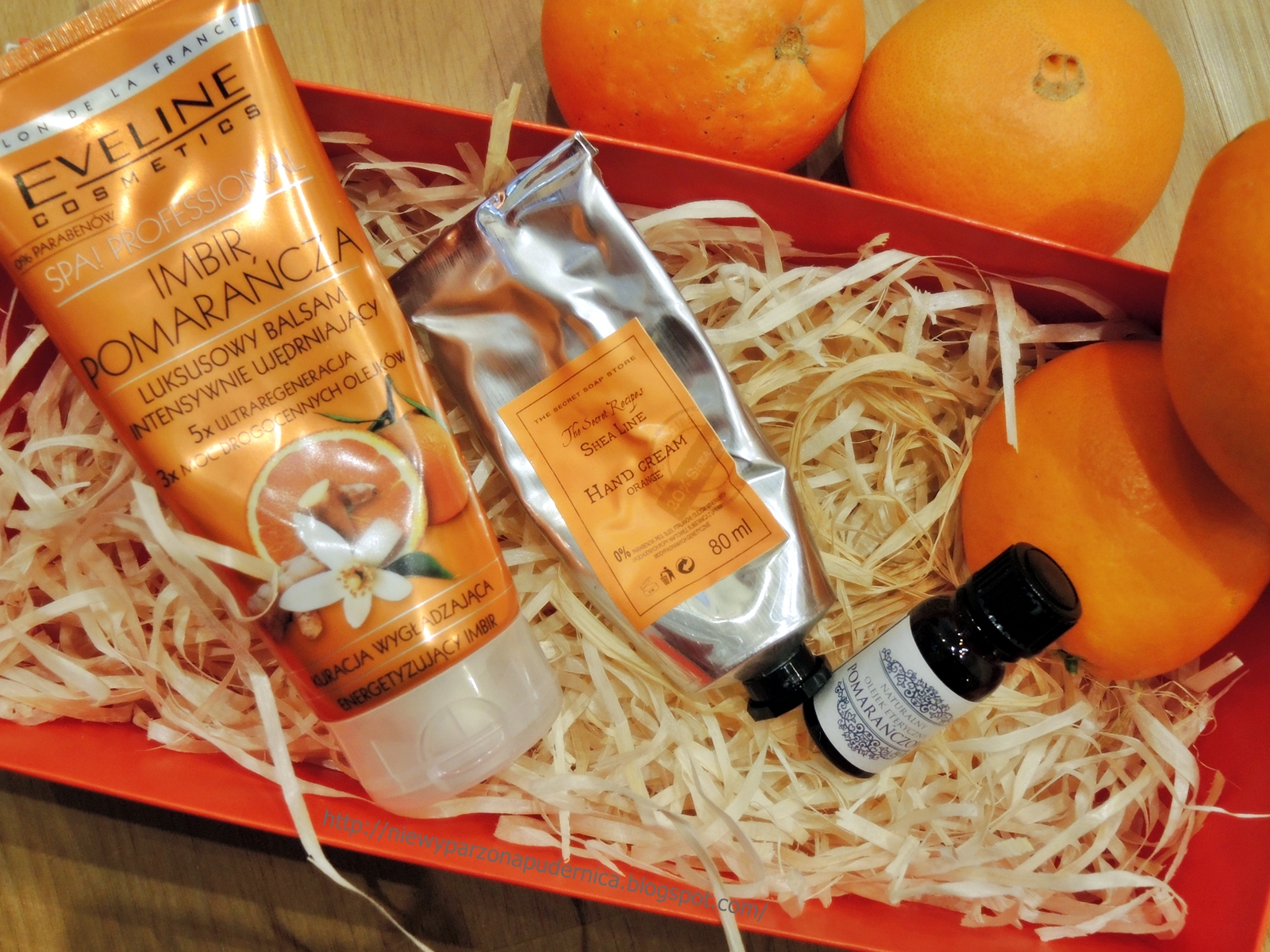 Taki zestaw towarzyszy mi od kilku tygodni. Troszkę już wyduszony i wymęczony, ale absolutnie niesamowity. Olejek od Optima Plus, balsam od Eveline i krem do rąk od The Secret Soap Store. Pomarańcze z Lidla, bo nie było kiedy polecieć na Sycylię 😉 Wszystkie 3 produkty, z pomarańczami 4, pachną soczyście i pięknie, i przytargałam je ze spotkania blogerek. Aromat balsamu i kremu na długo pozostaje na skórze i towarzyszy nam przez cały dzień. Olejek natomiast to świetne uzupełnienie- dom w tej samej nucie zapachowej. Balsam przełamany jest imbirowym obłoczkiem, świetny pomysł, zima pełną gębą.