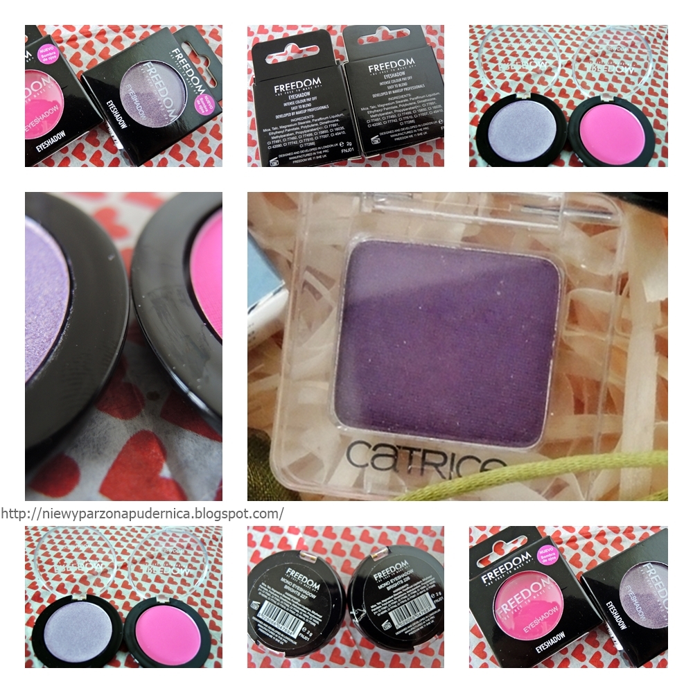 Zacznijmy od Freedomków. Trafił mi się neonowy, matowy róż nr 226 i satynowy fiolecik nr.227. Oba piękne. Chociaż foty z neonowym makijażem gdzieś mi się zawieruszyły, ale zajrzyjcie na mój Instagram, tam coś się pałęta. Cienie pięknie napigmentowane, nie kruszą się, pokrywają powieki równomiernie, można się z nimi bawić i malować do bólu. Chociaż w sumie to mnie nic nie bolało. Róż jest idealnie matowy i nasycony, a fiolet pięknie lśni. Jeśli dodam, że cienie to wydatek rzędu 5 złotych za sztukę, to nic ino brać. Nie mam Freedomom nic do zarzucenia i chętnie przygarnęłabym inne kolory.