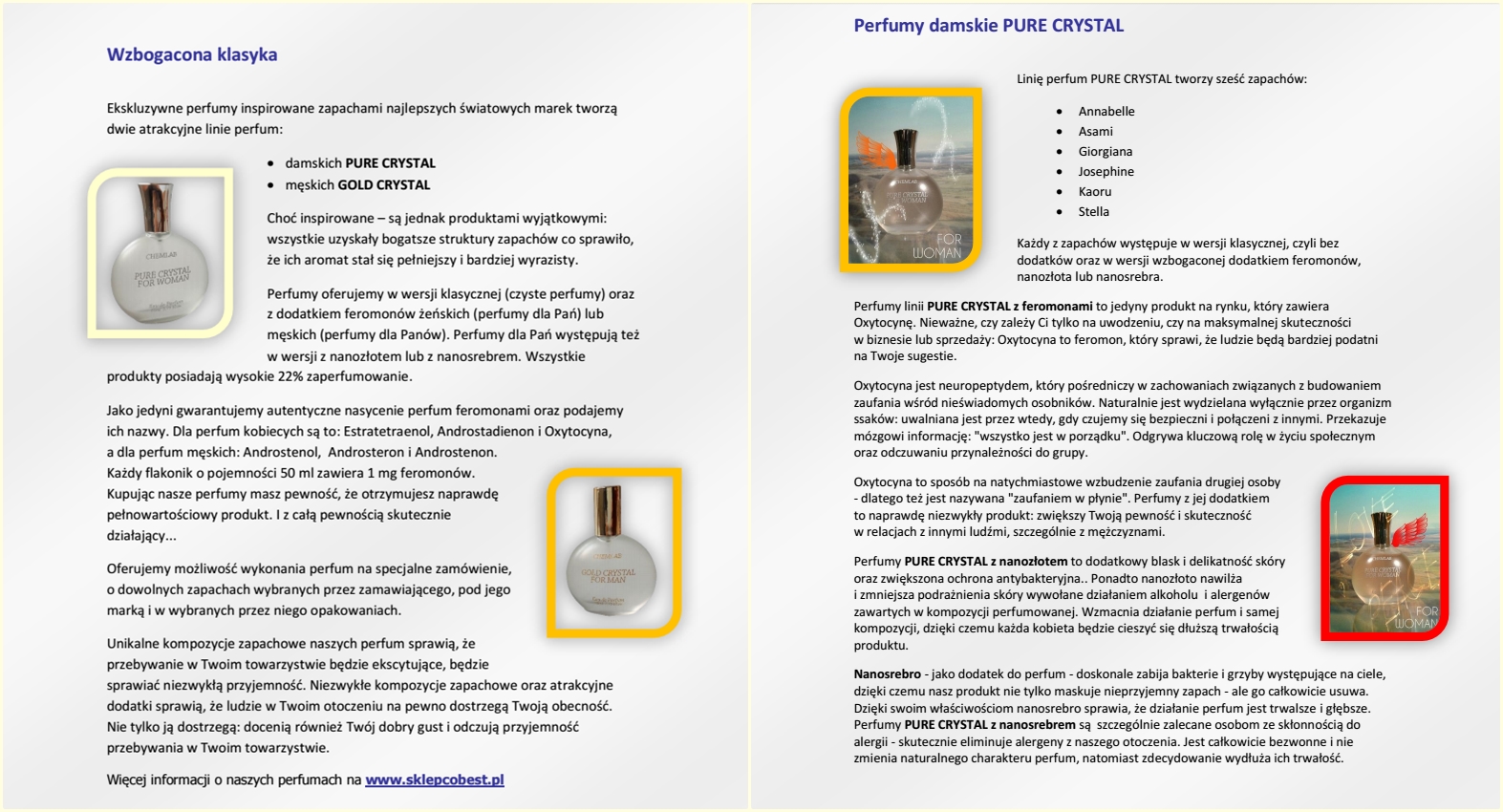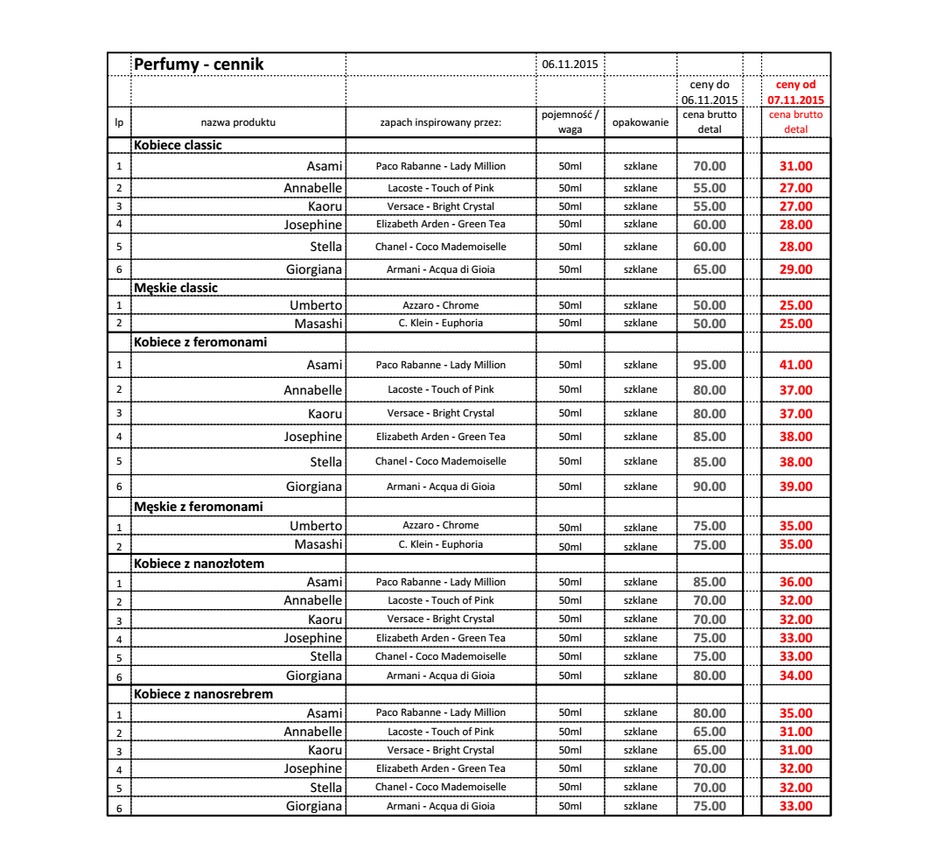 W kilku słowach- mamy w ofercie zapachy damskie i męskie. Dodatkowo wszystkie perfumy dzielą się na klasyczne, z feromonami, z nanozłotem i z nanosrebrem. Do wyboru do koloru. Wszystkie zapachy są wysoko zaperfumowane, jest to aż 22%. Są to perfumy, a nie wody perfumowane, czy toaletowe. Trzeba na to zwrócić uwagę, bo sama nacięłam się nie raz na coś, co miało być perfumami, a okazywało się, że zaperfumowienie było tak niskie, że nie były to perfumy. Tutaj mamy do czynienia z prawdziwymi perfumami! Czyli w praktyce- zapach jest trwalszy i intensywniejszy. No i oto chodzi! Miłą niespodzianką są ceny! Akurat od minionego weekendu , możecie kupić perfumy w niższych cenach niż dotychczas. Wrzucę Wam cennik, bo wydaje mi się to bardzo istotne 🙂