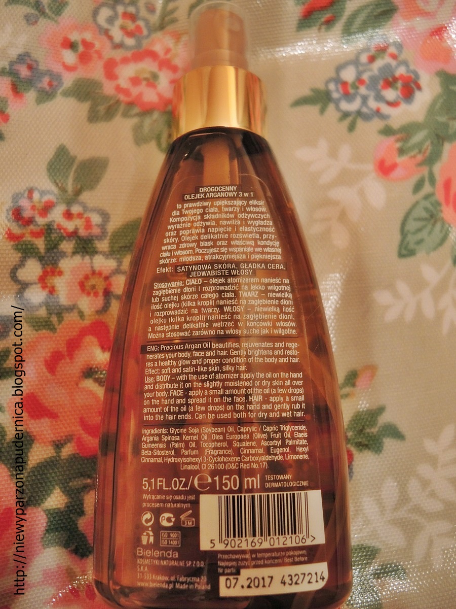 150 ml olejku w poręcznej butelce, atomizer też na poziomie, super działa. No, u mnie to czas przeszły, bo mi flaszka spadła wprost na ten nieszczęsny atomizer i coś pękło. Przełożyłam jakiś z innej flaszki- nie było wyjścia. Butelka wytrzymała, po upadku na płytki jest cała i zdrowa. Takie crash testy to tylko u mnie 😉 A co z działaniem i tłustością? Otóż drodzy Państwo pierwszy olejek, który mnie nie wkurwia. Wchłania się! Niebywałe! Może nie jest to jakieś zawrotne tempo, ale się wchłania, jestem w pozytywnym szoku. A jak mi się nie chciało czekać, to wkładałam ciuchy i też nic się nie brudziło. Ciało ładnie nawilżone i ten zapach. Dla samego zapachu warto wypróbować, tym bardziej, że olejek to koszt niewiele powyżej 10 złotych.